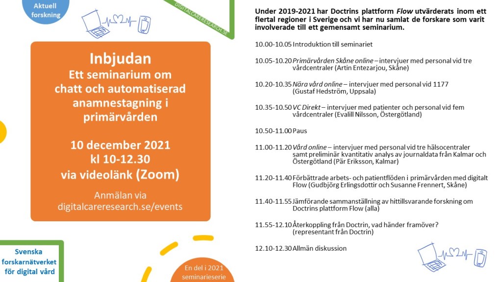 Webbinarium: chatt och automatiserad anamnestagning i primärvården via Doctrins plattform Flow 10/12 Posted byirenemuliOctober 20, 2021Posted inUncategorized Share this: Click to share on X (Opens in new window) X Click to share on Facebook (Opens in new window) Facebook Like Loading... Related