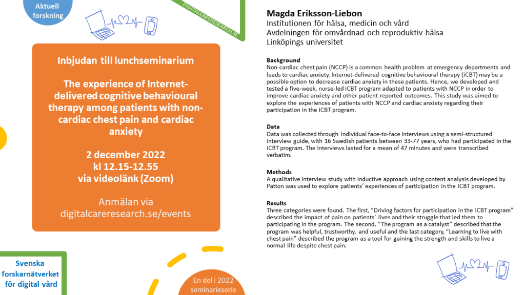 Forskarnätverket bjuder in till ett lunchwebbinarium med Magda Eriksson-Liebon, Institutionen för hälsa, medicin och vård, Avdelningen för omvårdnad och reproduktiv hälsa Linköpings universitet. (Läs mer nedan)